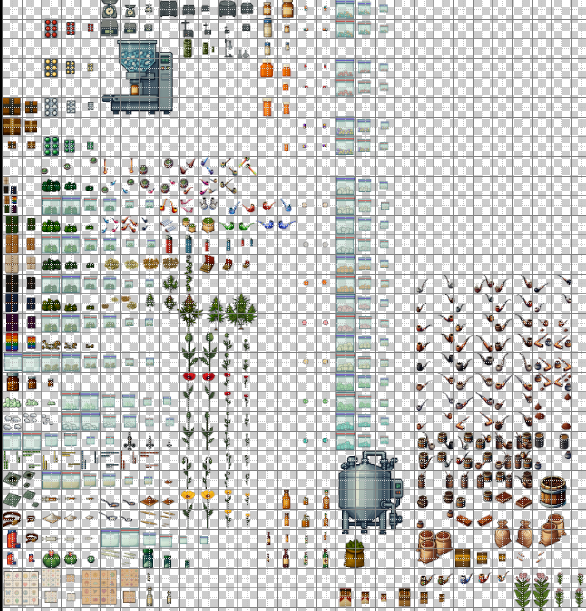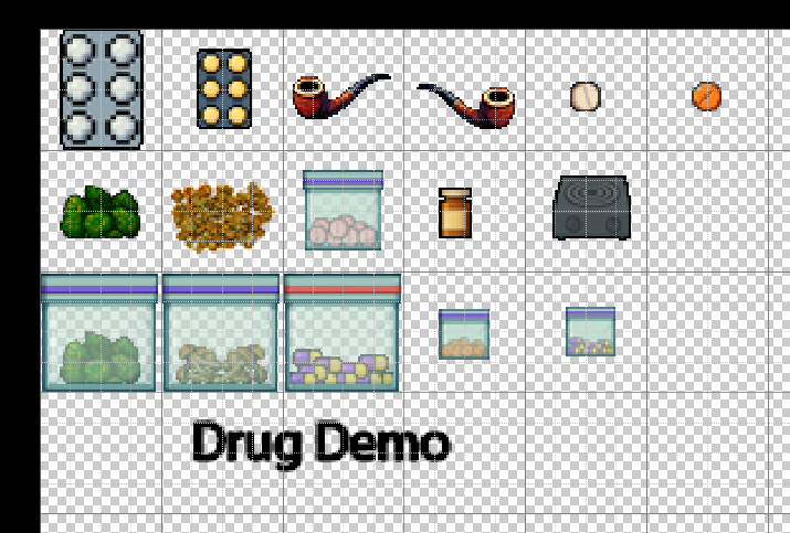 This is a collection of assets that I made for use in any game of your making. These assets include two of my other asset packs, (Tobacco and Marijuana Pipes) and a whole bunch of new pharmaceuticals. Most of these sprites have different size variations (48x48, 32x32, and some smaller 20x20). You may alter these but no distribution or selling of these or any altered assets.